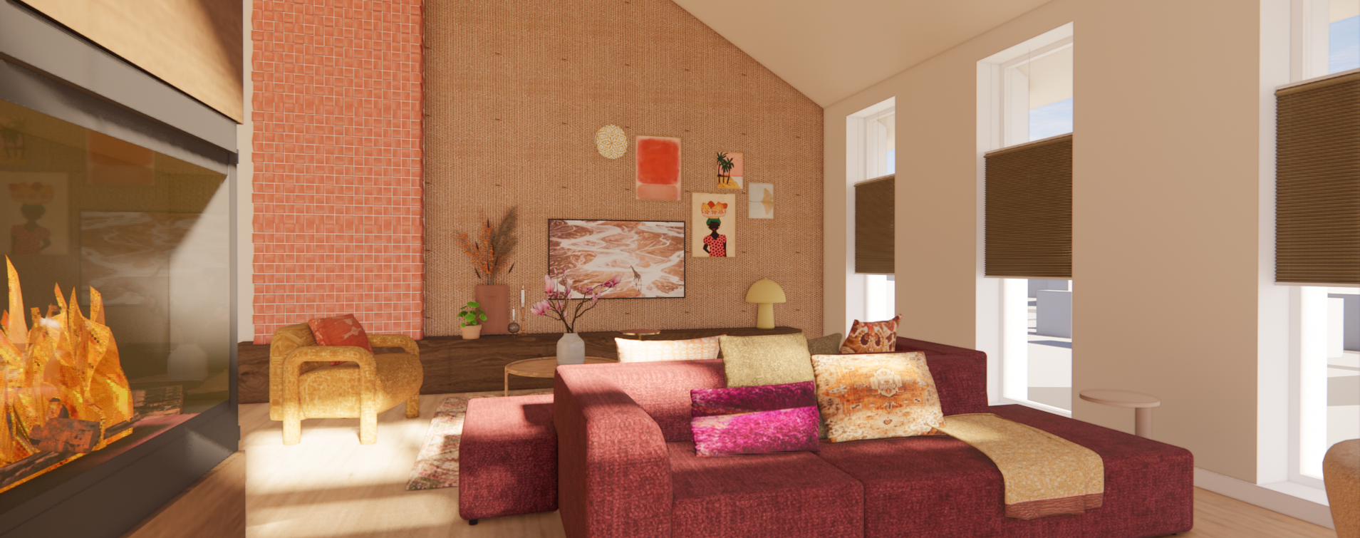 Omdat het penthouse al verkocht was, werkte ik met fictieve klanten. Maar ik gaf ze een verhaal: een stel met een passie voor reizen. Vanuit die gedachte ontstond mijn creatieve richting – met als inspiratiebron de kleuren en sferen van Marrakech. Tijdens een eerdere stage hoorde ik over inspiratiereizen naar Marokko, en de rijke kleuren, texturen en warmte zijn me altijd bijgebleven.